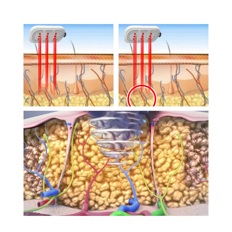 O aparelho utiliza radiofrequência de 1 MHz e energia de frequência intermediária modulada em amplitude de 1 a 4000 Hz, luz vermelha de alta intensidade de 658 nm, cada uma com potência de 100 mW. As três funções de radiofrequência, microeletrônica de média frequência e luz vermelha podem trabalhar simultaneamente para converter os íons no corpo de negativos para positivos e gerar energia térmica. Nesse momento, um calor profundo de 42 a 45 °C é gerado profundamente no corpo. A geração contínua de calor profundo reduzirá o tamanho das células de gordura e terá um bom efeito na modelagem corporal.